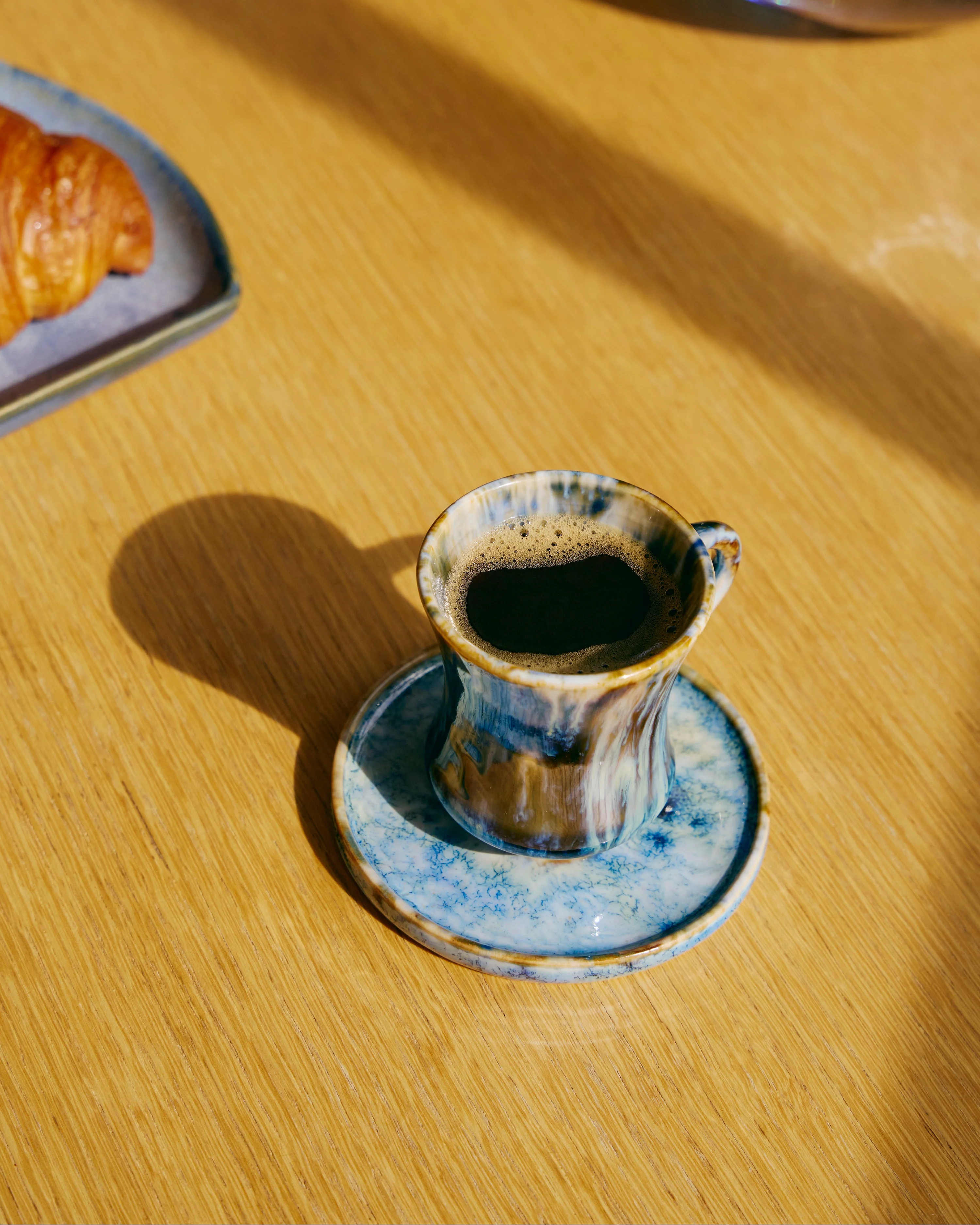 Ciao! The Espresso Set by Seth is back - this time in a beautiful, horn-like blue swirl glaze. Features two cups and two saucers, this espresso set will make your next coffee break feel like you're al fresco in Firenze.
